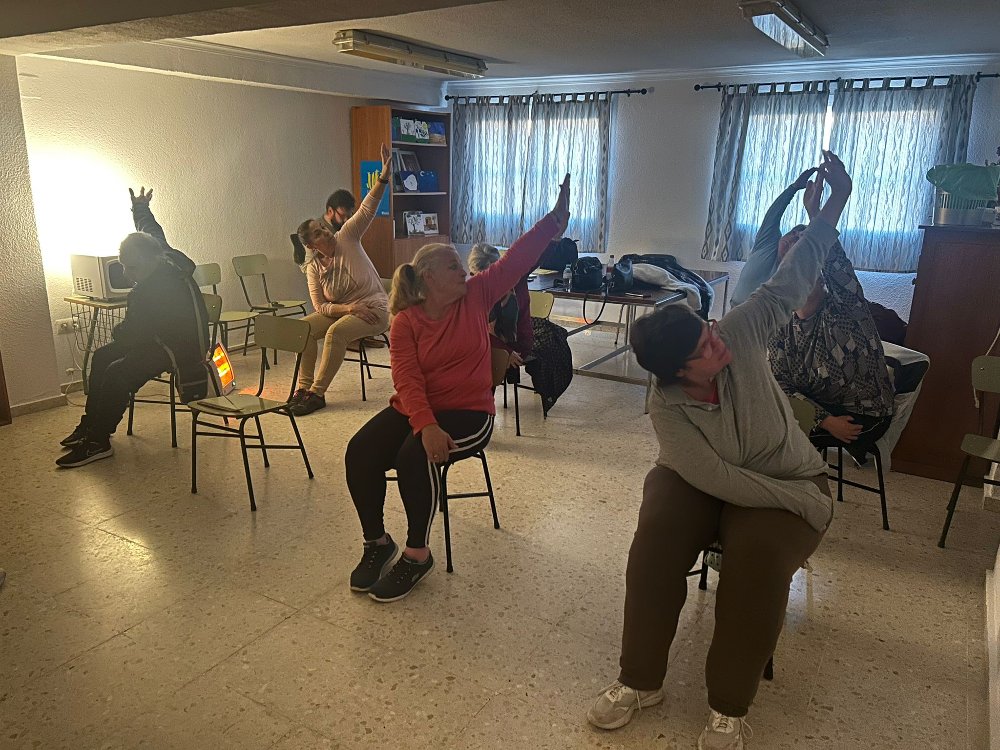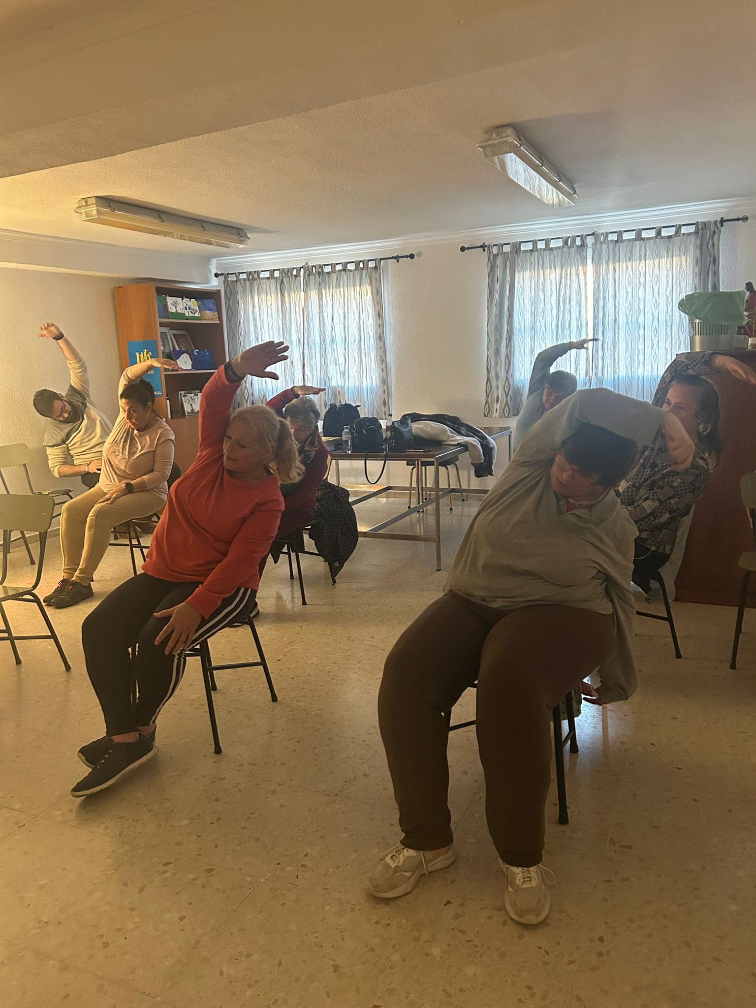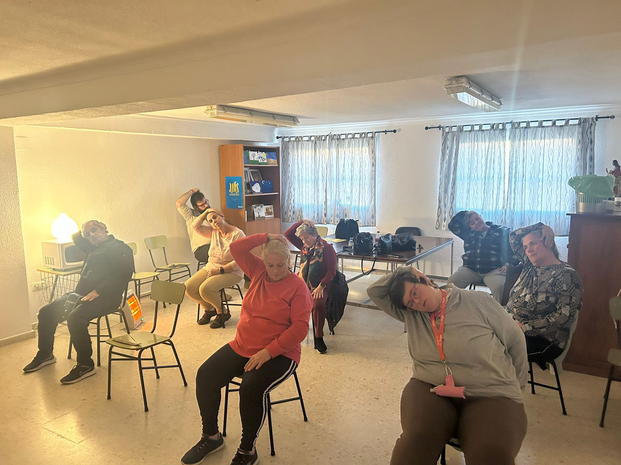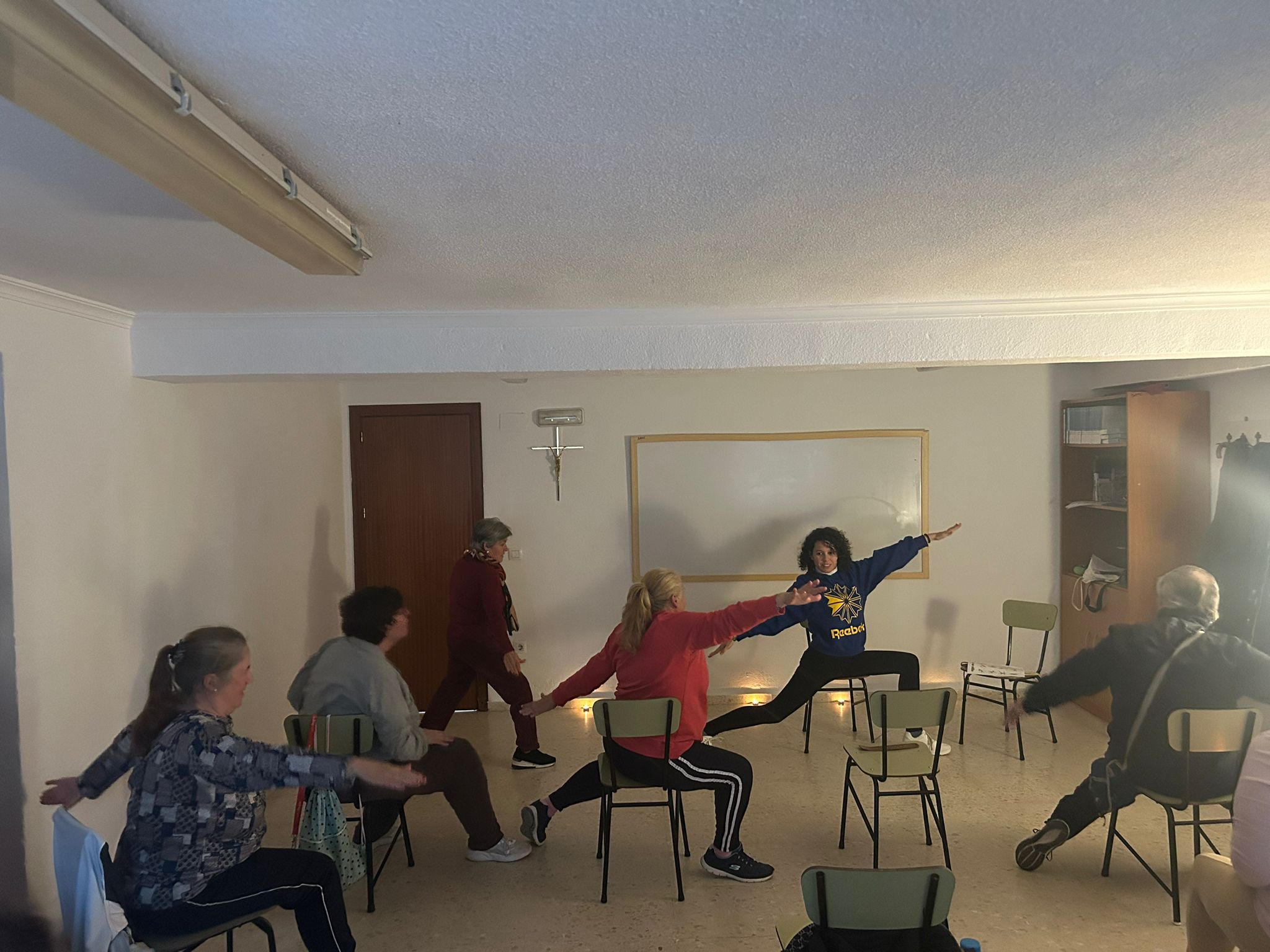 La práctica consistía en demostrarles, que más allá de los impedimentos físicos, el yoga es un deporte apto para cualquier persona, y puede practicarse incluso sentadas. Aunque, normalmente, las posturas de yoga se realizan en contacto con el suelo, pero en esta ocasión se realizó una variante muy innovadora donde los ejercicios y movimientos se adaptan y se pueden realizar sentados en una silla.