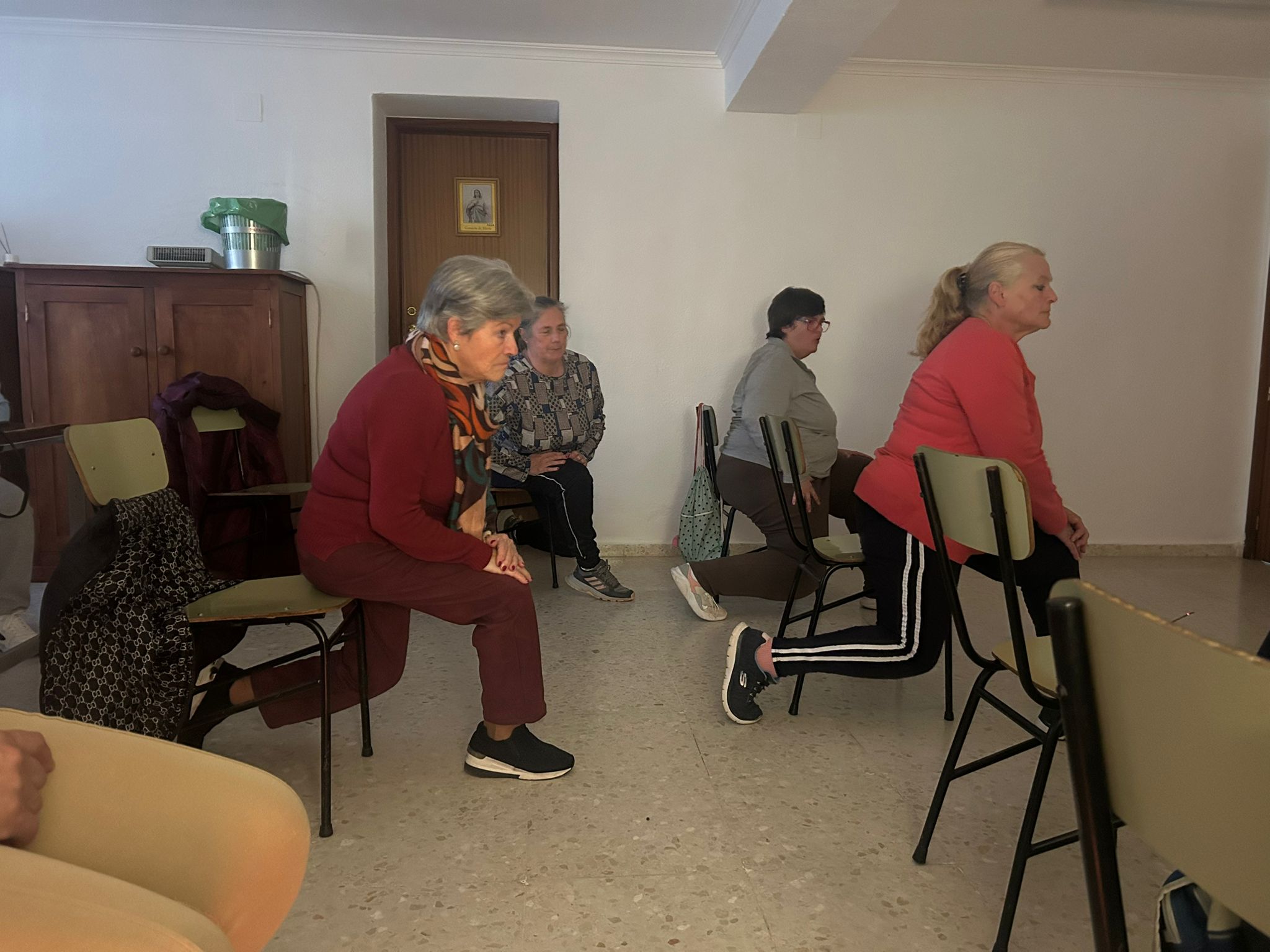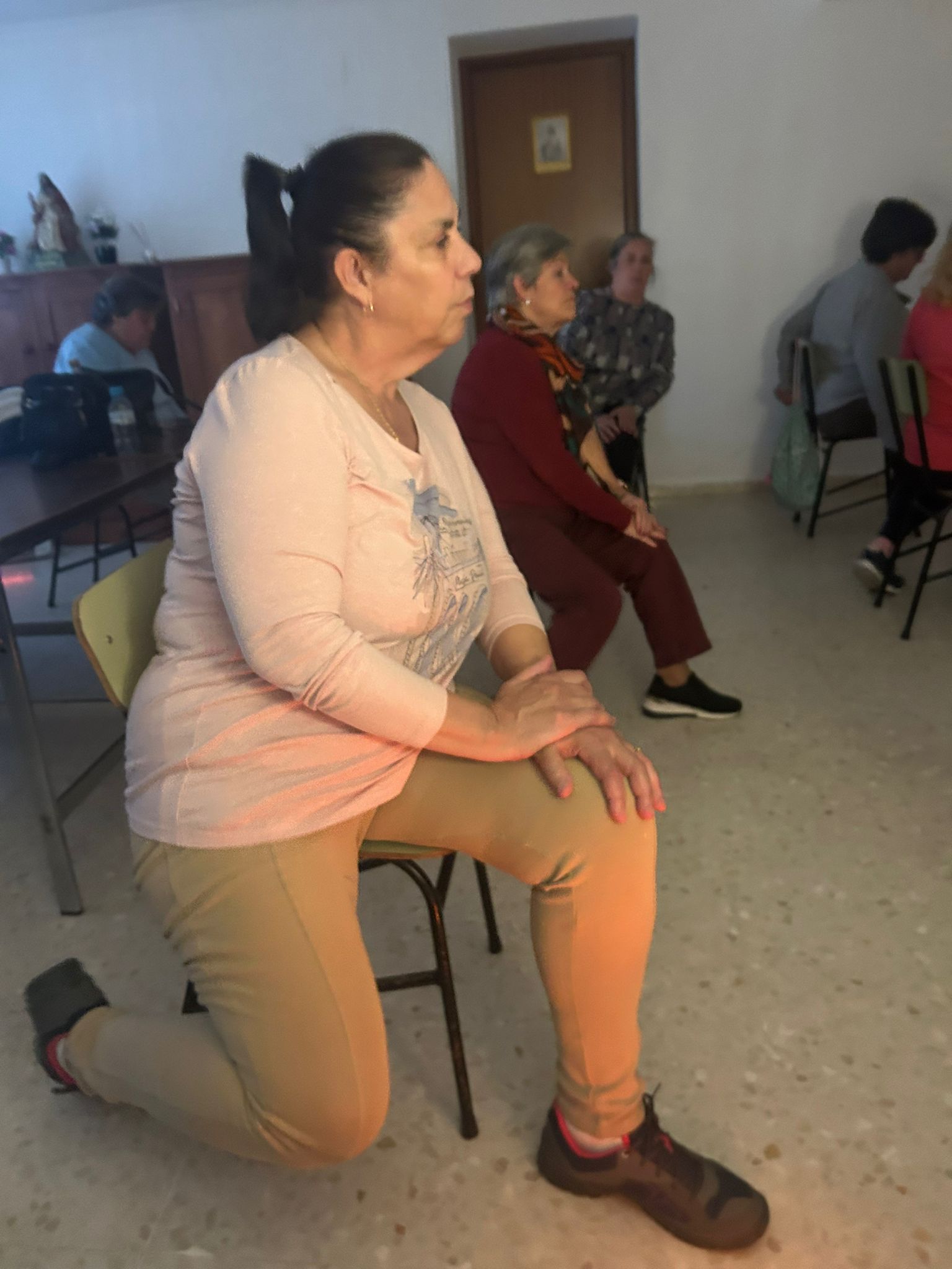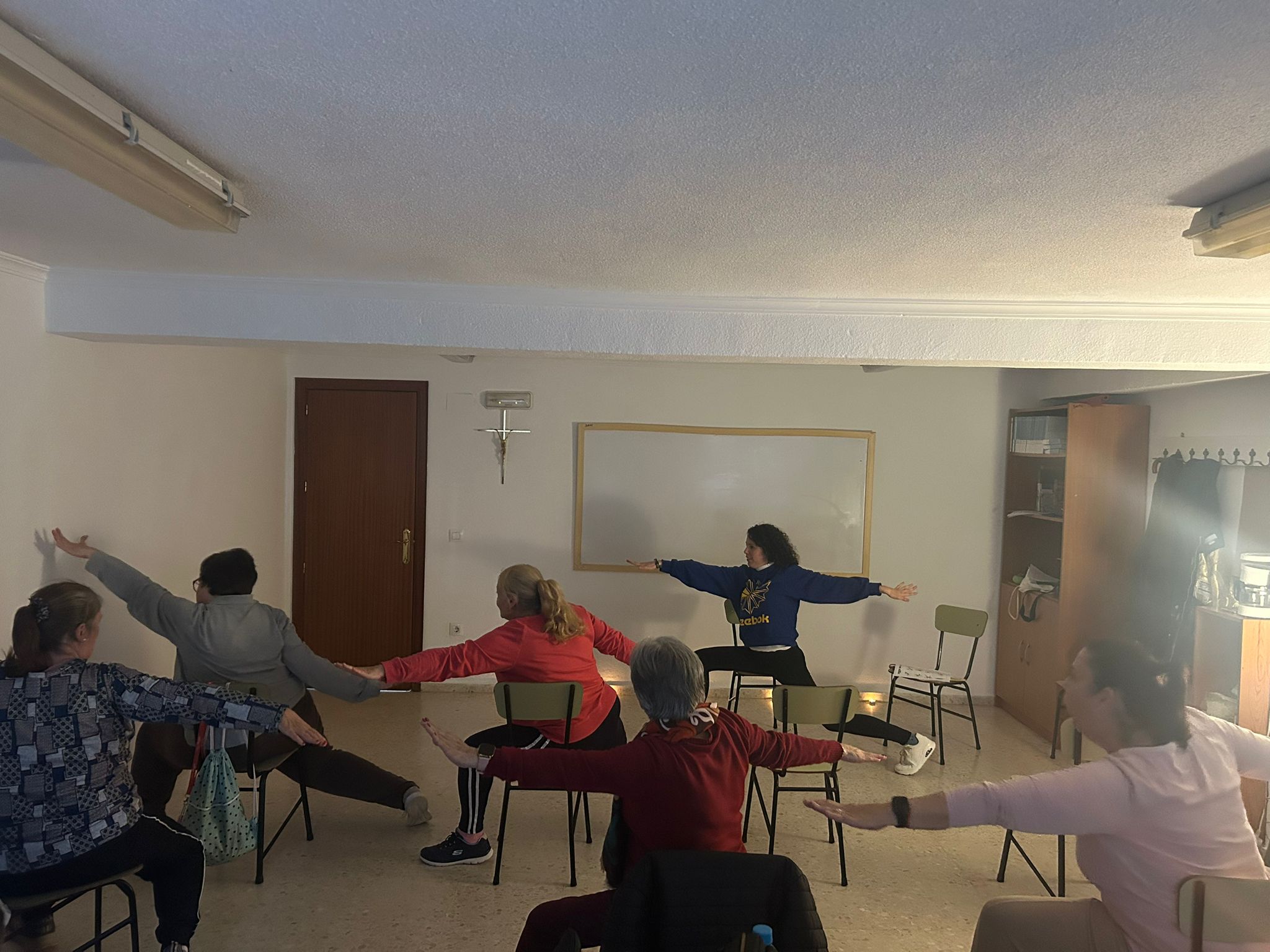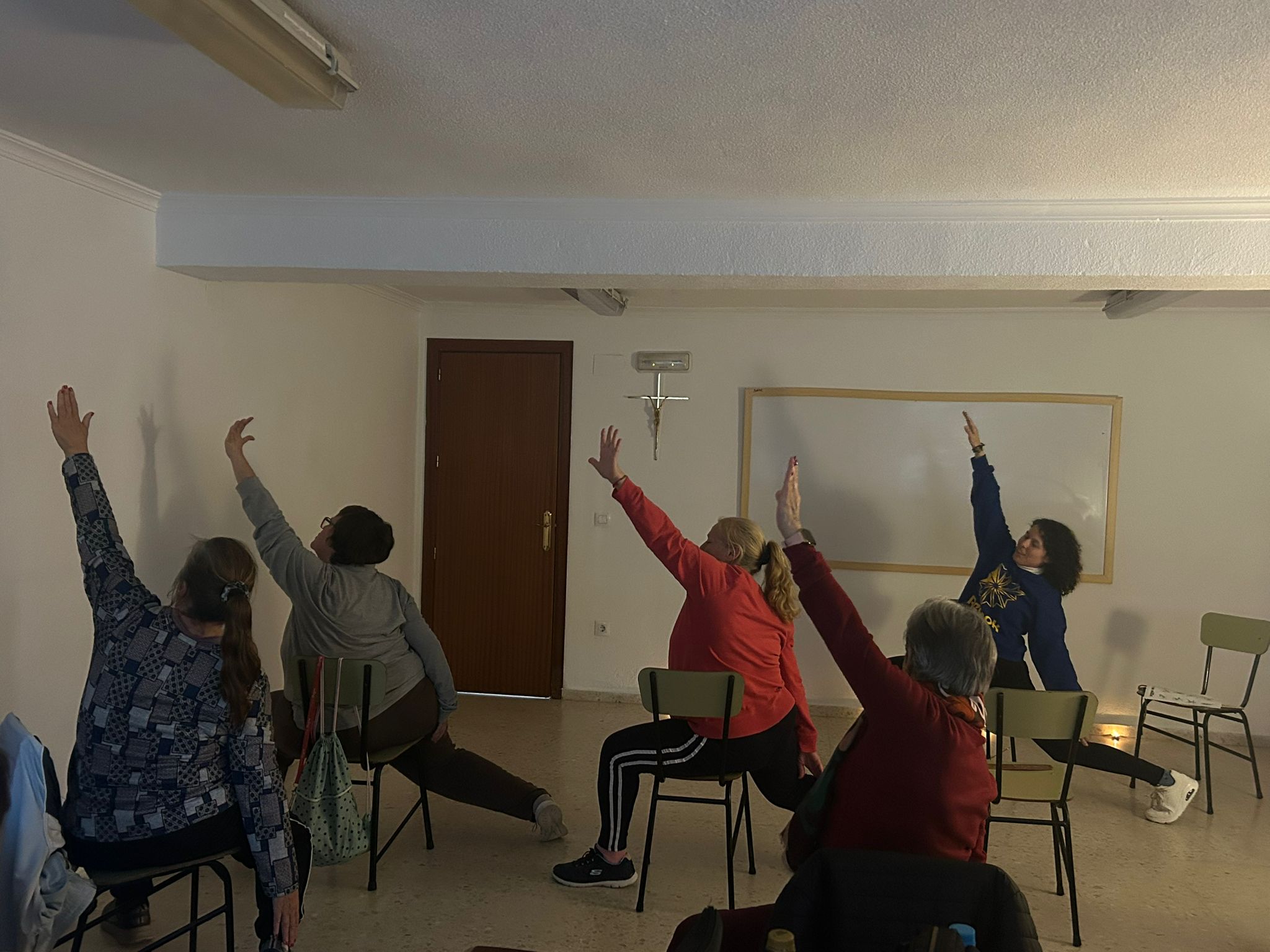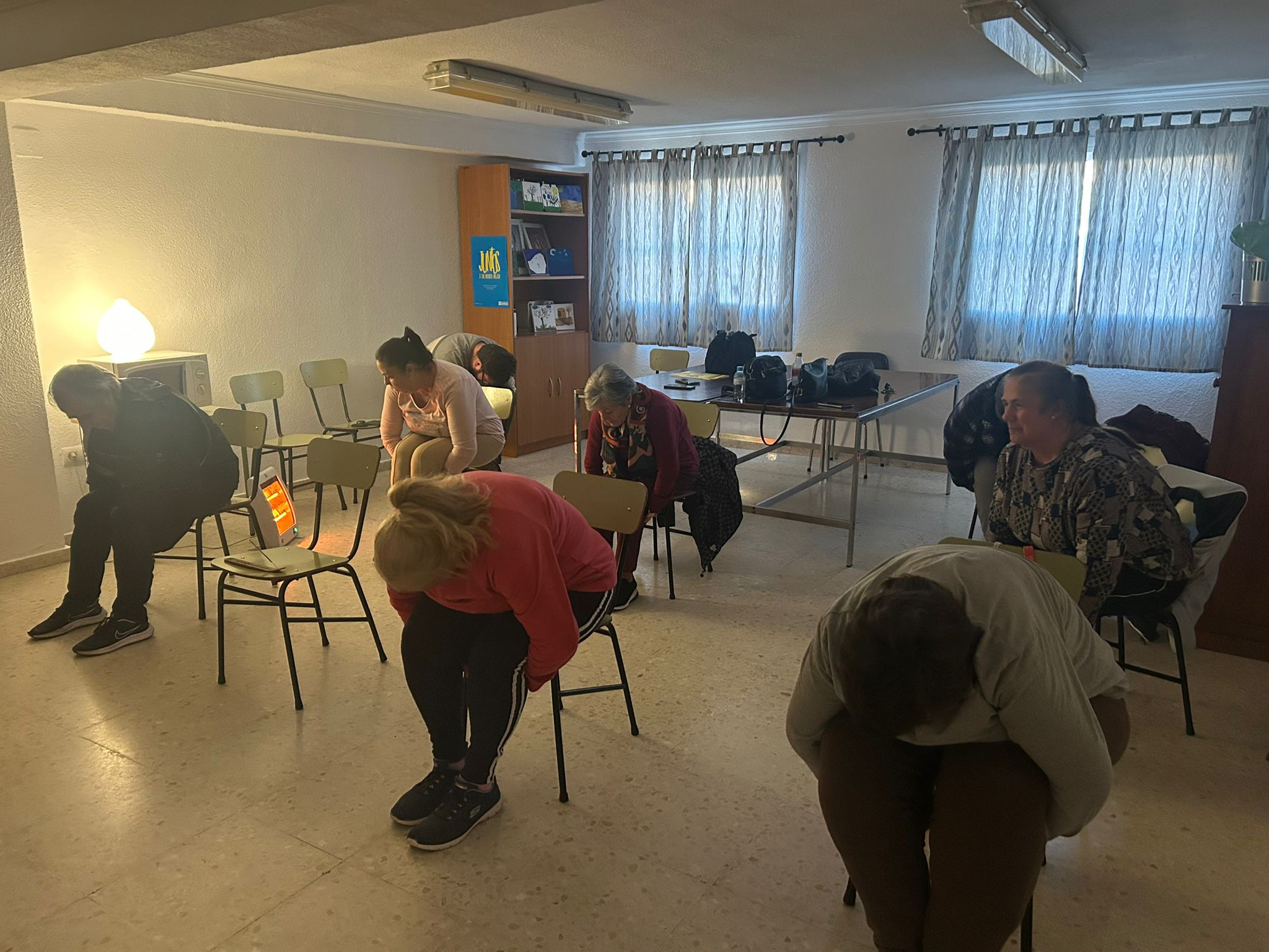 La práctica consistía en demostrarles, que más allá de los impedimentos físicos, el yoga es un deporte apto para cualquier persona, y puede practicarse incluso sentadas. Aunque, normalmente, las posturas de yoga se realizan en contacto con el suelo, pero en esta ocasión se realizó una variante muy innovadora donde los ejercicios y movimientos se adaptan y se pueden realizar sentados en una silla.