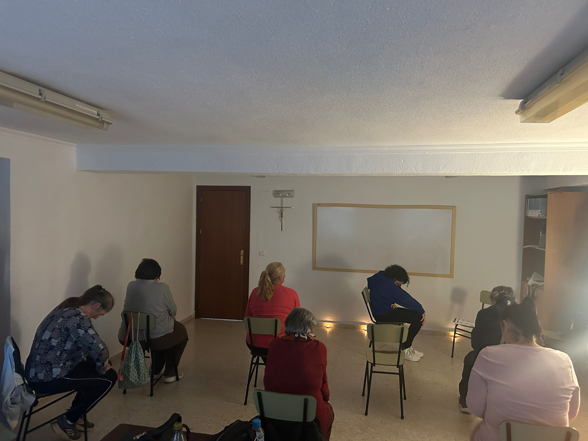 Precisamente a esta práctica, que reporta múltiples beneficios para el sistema respiratorio, nervioso, digestivo… y que te ayuda a conciliar sueño y en tus relaciones personales del día a día, se ha basado el último taller que realizamos en el barrio. Antes de comenzar la sesión se les explicó a las asistentes en qué consistía y cuales son sus beneficios. Después de esto tratamos de crear un ambiente propicio de meditación para comenzar la actividad lo mas relajadas posibles y con la máxima atención. Para ello se colocaron velas, se apagaron las luces y se encendió incienso, creando un espacio seguro donde se dispusieron varias sillas separadas.